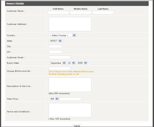 ResAvenue, your online hospitality solution provider offers you more than just an online reservation engine. It is offers you a comprehensive range of online tools including a customizable invoicing feature. All you need to do is log into your ResAvenue M.A.R.S. account and click on Advance Administration in the navigation bar. Click on the Invoice option in the dropdown to open up the following page: