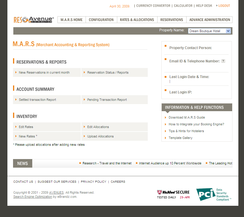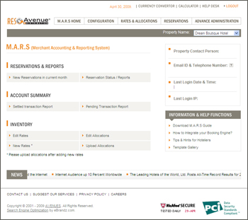 The new and improved ResAvenue M.A.R.S (Merchant Accounting and Reporting System) interface now makes managing your inventory an enjoyable experience! The new M.A.R.S interface is designed keeping in mind user convenience and satisfaction. Its enhanced navigation system provides you with easy accessibility to different sections of your account and enables you to manage your property details, rates and allocations, reports and accounts effectively and effortlessly.